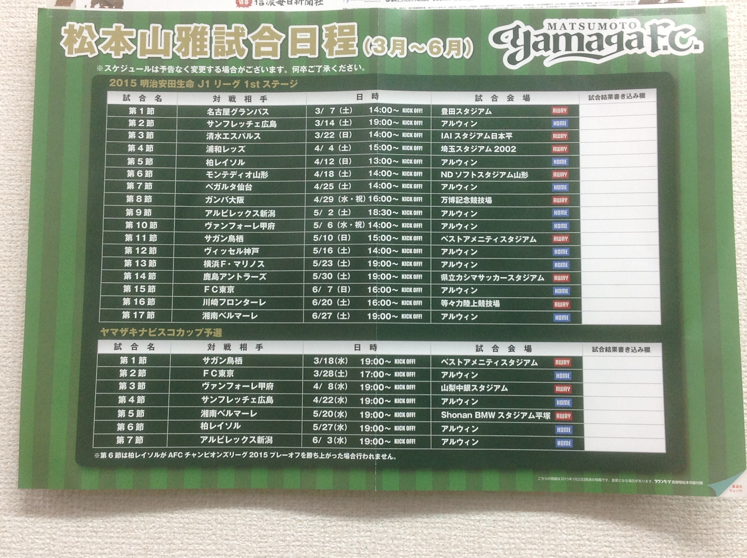 松本山雅FCは、1965年当時に長野県選抜の選手を中心とした歴史あるチームで、 2015年シーズンより初めてJ1に昇格しました。 クラブ名は当時の選手が松本駅前にあった喫茶店「山雅」へよく通っていたことに由来しているそうです。 (松本山雅FCホームページより)